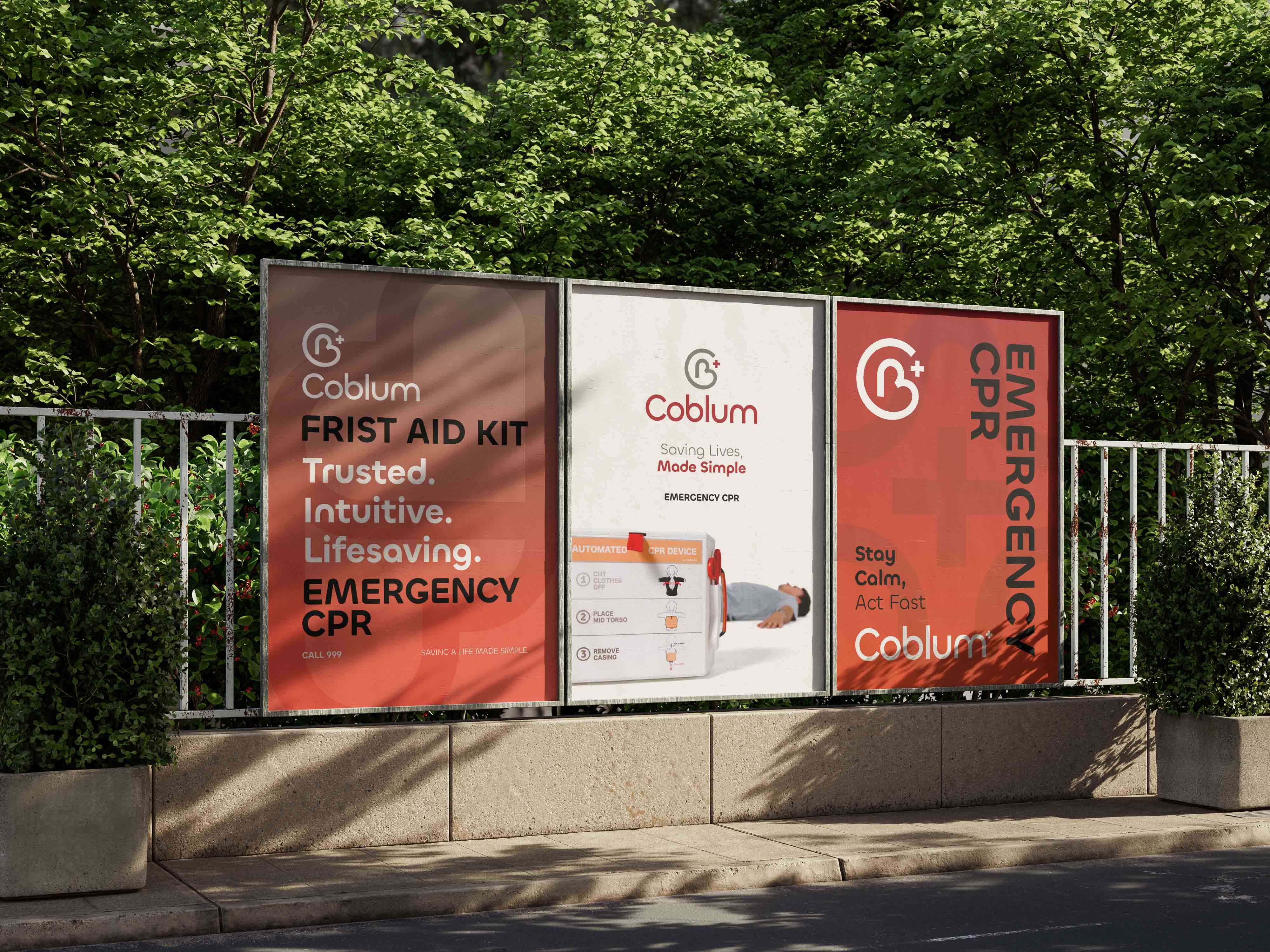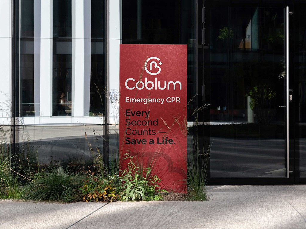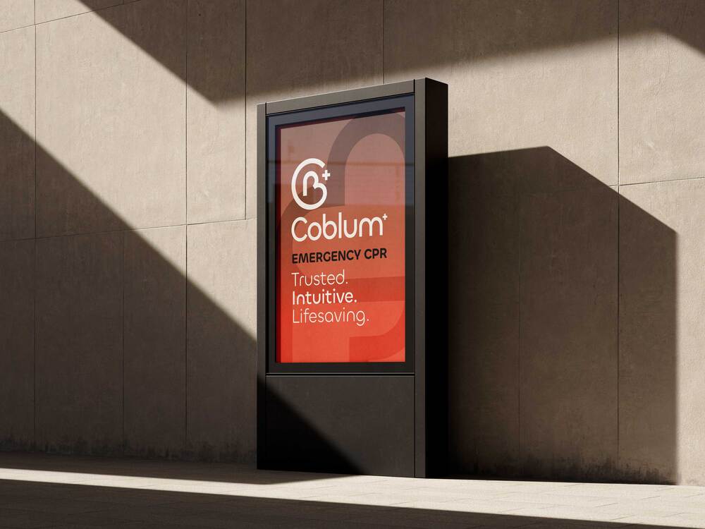 Coblum needed a brand system that made emergency response feel clear, calm, and accessible. We developed their identity from strategy to visuals — building a symbol rooted in the C + B + heart concept, a bold medical colour system, a set of intuitive brand elements, and clear communication built for high-stress situations. We extended the identity across packaging, signage, on-device graphics, and marketing collateral to create a consistent, trusted presence within the healthcare and emergency-equipment space.